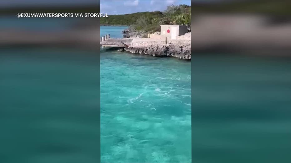 The shark had emerged from under the boat during a tour Wednesday in the southern Bahamas organized by Exuma Water Sports.