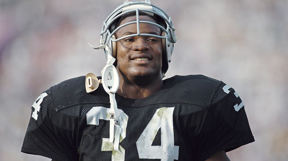 File: Bo Jackson fullback for the Los Angeles Raiders, on October 15, 1989 at the Los Angeles Memorial Coliseum, Los Angeles, California, United States. (Photo by Mike Powell/Allsport/Getty Images)