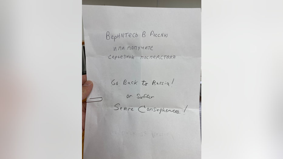 One handwritten letter told the owners to "go back to Russia or suffer severe consequences." He said he reported it to police and stepped up the café's security, including installing new cameras.