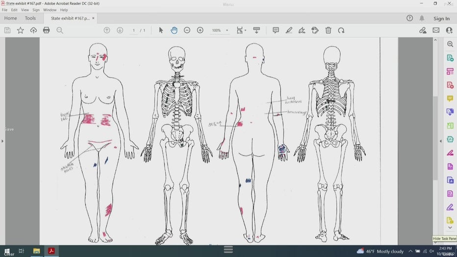 On redirect, Deputy District Attorney Lesli Boese asked if all of the findings from her diagrams were from the initial autopsy work. She said "yes." Boese asked if she could have brought in a skeleton and described the same injuries.
