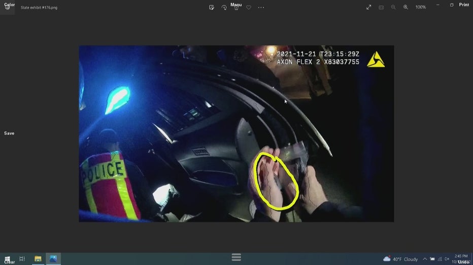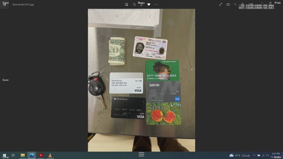 He said he received items that were on Brooks' person at the time of his arrest, including an ID card with Darrell Brooks' name and photo on it, a Quest card with Brooks' name on it, along with credit cards with Brooks' name on them and an EBT card with Brooks' girlfriend's name on it. He added there was $4 in cash and a Ford key.