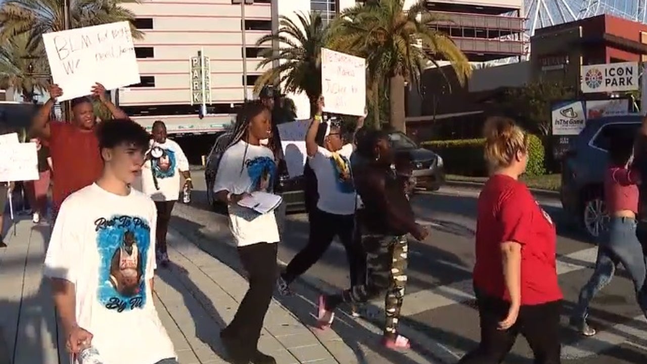 About two dozen people marched along International Drive on Tuesday calling for the Orlando FreeFall ride to be shut down for good.