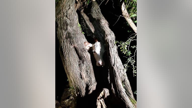 Firefighters said it took about an hour and 20 minutes for rescuers to cut into the tree and free the cow. How it got there is anybody's guess.