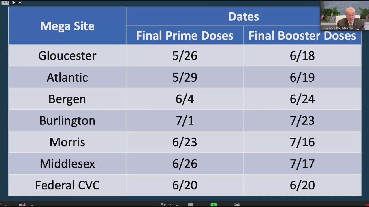 New Jersey will be shutting down its six mass COVID-19 vaccination sites as the state moves from a mega-site model to relying on about 1,800 community inoculation sites.