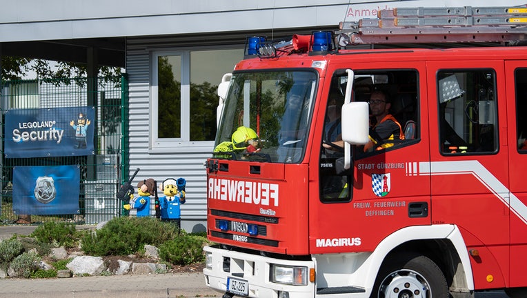 A fire truck drives past the entrance to Legoland in Günzburg, Swabia. (Photo by Stefan Puchner/picture alliance via Getty Images)