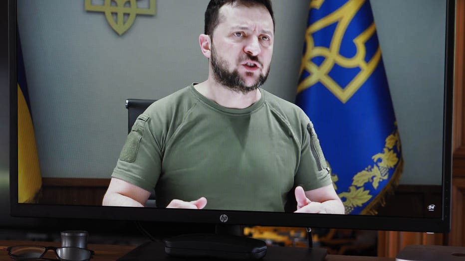 In this photo illustration, a screen showing president of Ukraine Volodymyr Zelensky's speech before the members of the international tribunal in The Hague.Igor Golovniov/SOPA Images/LightRocket via Getty Images)