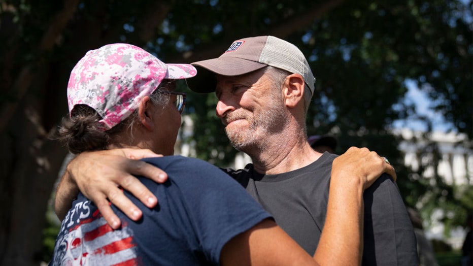 Comedian Jon Stewart, right, attends a rally outside of the U.S. Capitol to call on the Senate to pass the Pact Act, which aims to expand health care and benefits to veterans exposed to toxins while serving, on August, 2, 2022. (Tom Williams/CQ-Roll Call, Inc via Getty Images)