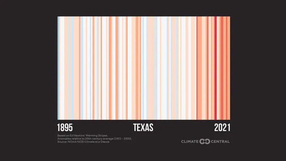 Climate Central has created "Warming Stripes" graphics for 179 cities, 49 states and the globe that include available data up to 2021.